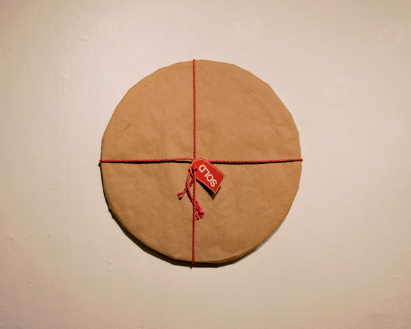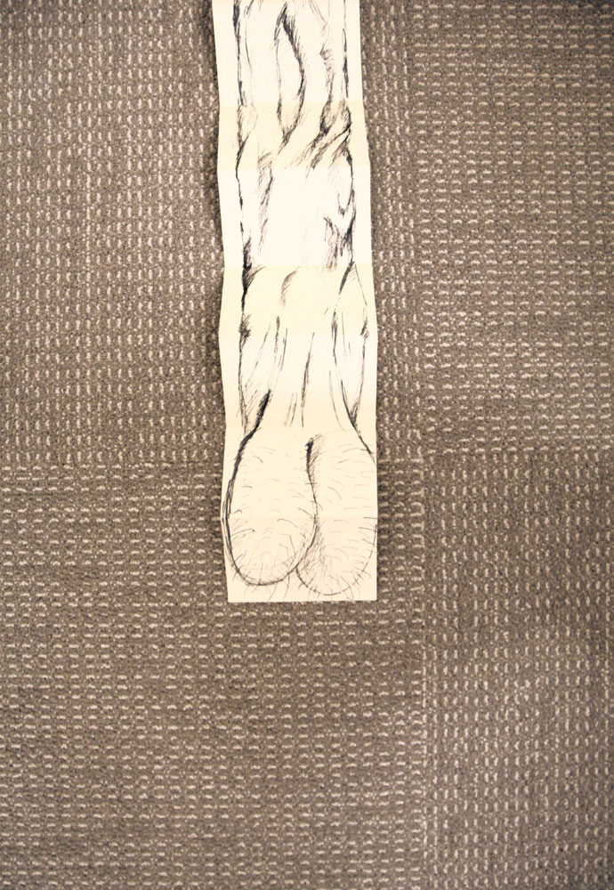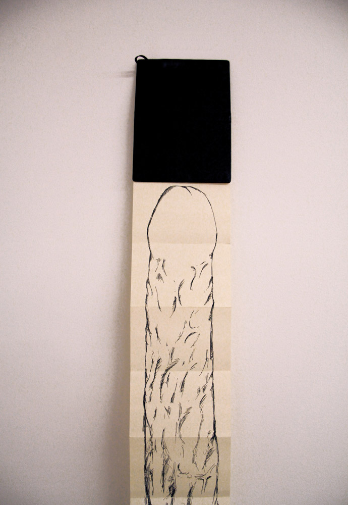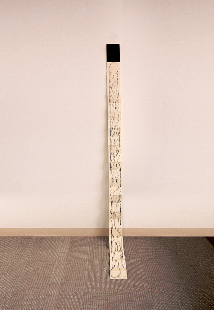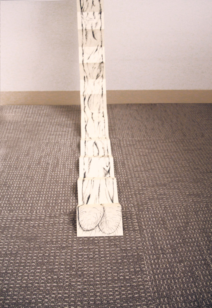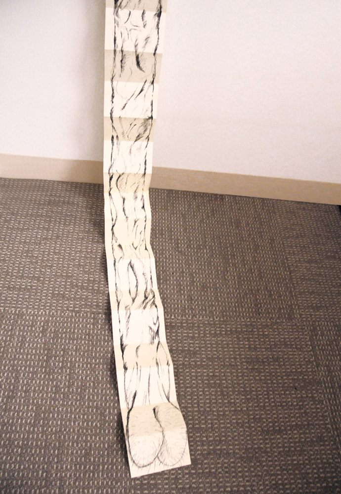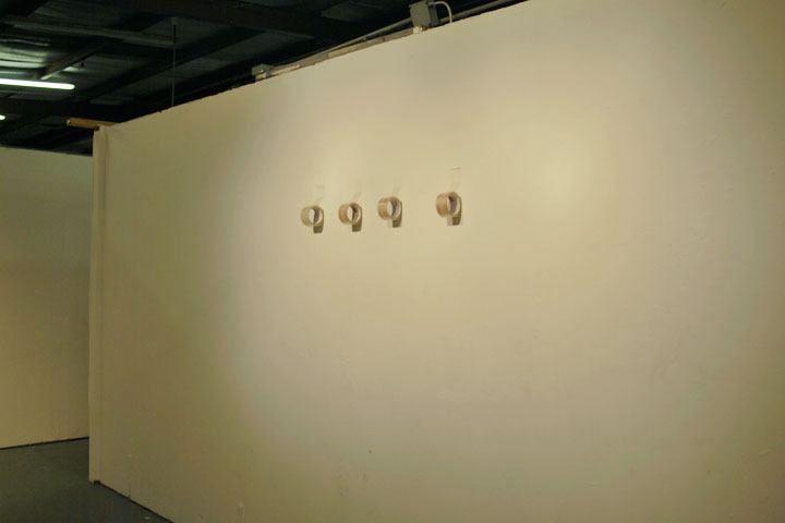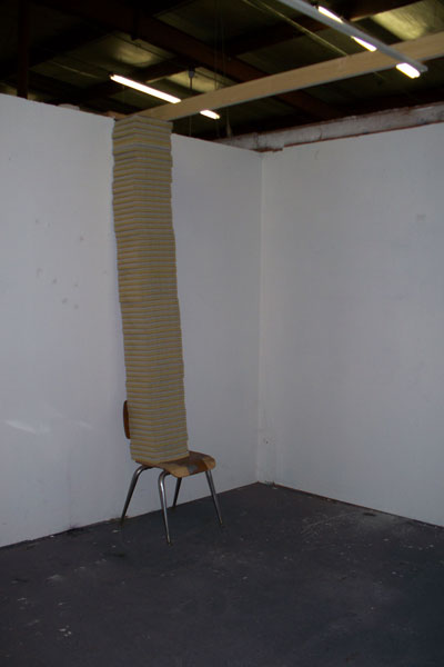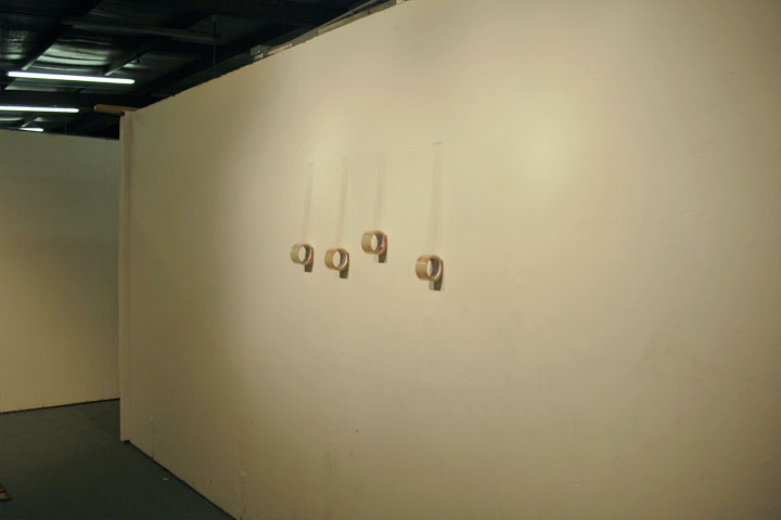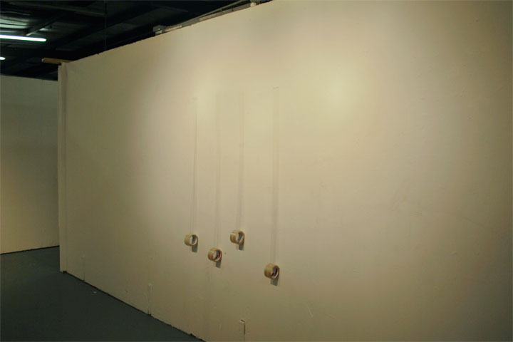 This installation was made using rolls of clear packing tape which were taped to the wall and left to unrravel during a gallery opening. The piece lasts about 10-12 hours which is the time it takes the rolls of tape to reach the floor. 2010