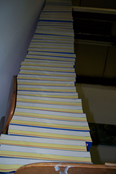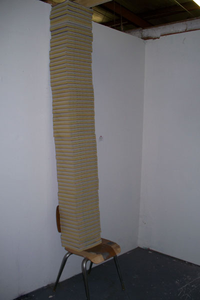 This installation consists of a series of 63 found phonebooks which were stacked on top of each other until they reached a beam at the end of the wall of the gallery. 2008