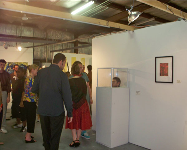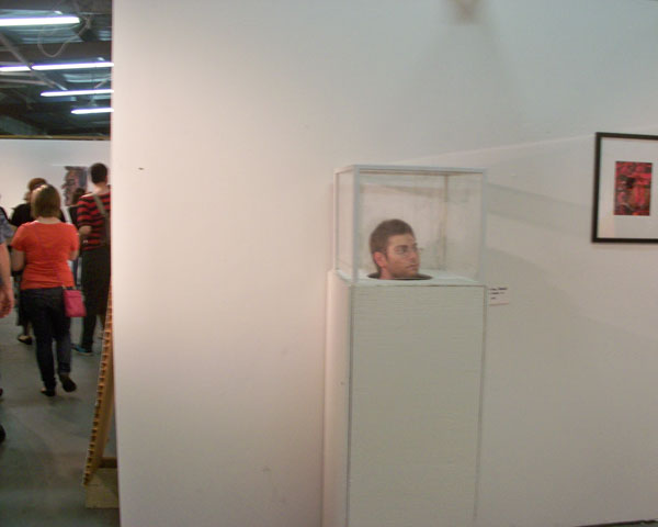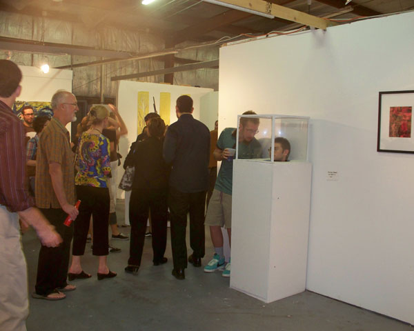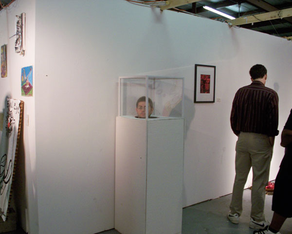 This installation consists of a hollow pedestal that has been adapted to hold a sitting subject, covered by a plexiglas box. The performance was executed during the First Friday Gallery hop in Tallahassee, at the Phylis Strauss Gallery. Nick Parparian was kind enough to participate on the performance and stayed inside the installation for over 1 hour, his instructions were to interact (or not) as much or as little as he wanted with the viewers. 2009