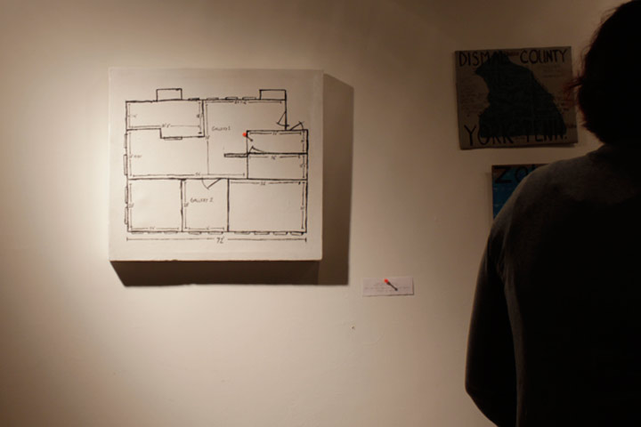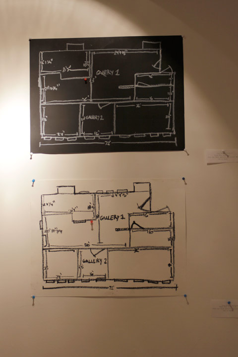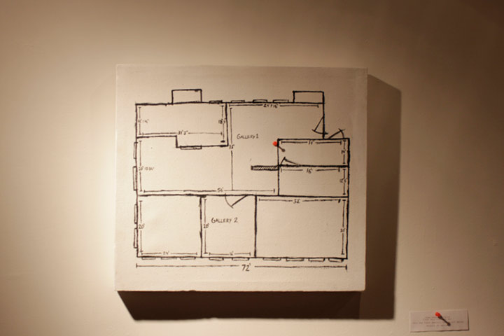 This installation consitst of paintings and drawings which are copies of the floorplan provided by the gallery in which the show will take place. These are finished by adding a red thumbtack on the work, on the day of the exhibition, marking its position in the gallery. 2012
