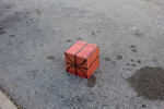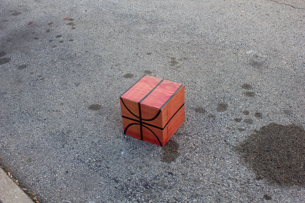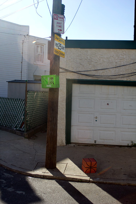 In this intervention a square basketball is left on the street for the kids to play with. The square ball fits the dimensions of the milk crate used as a basket by the kids in Fishtown Philadelphia , 2013